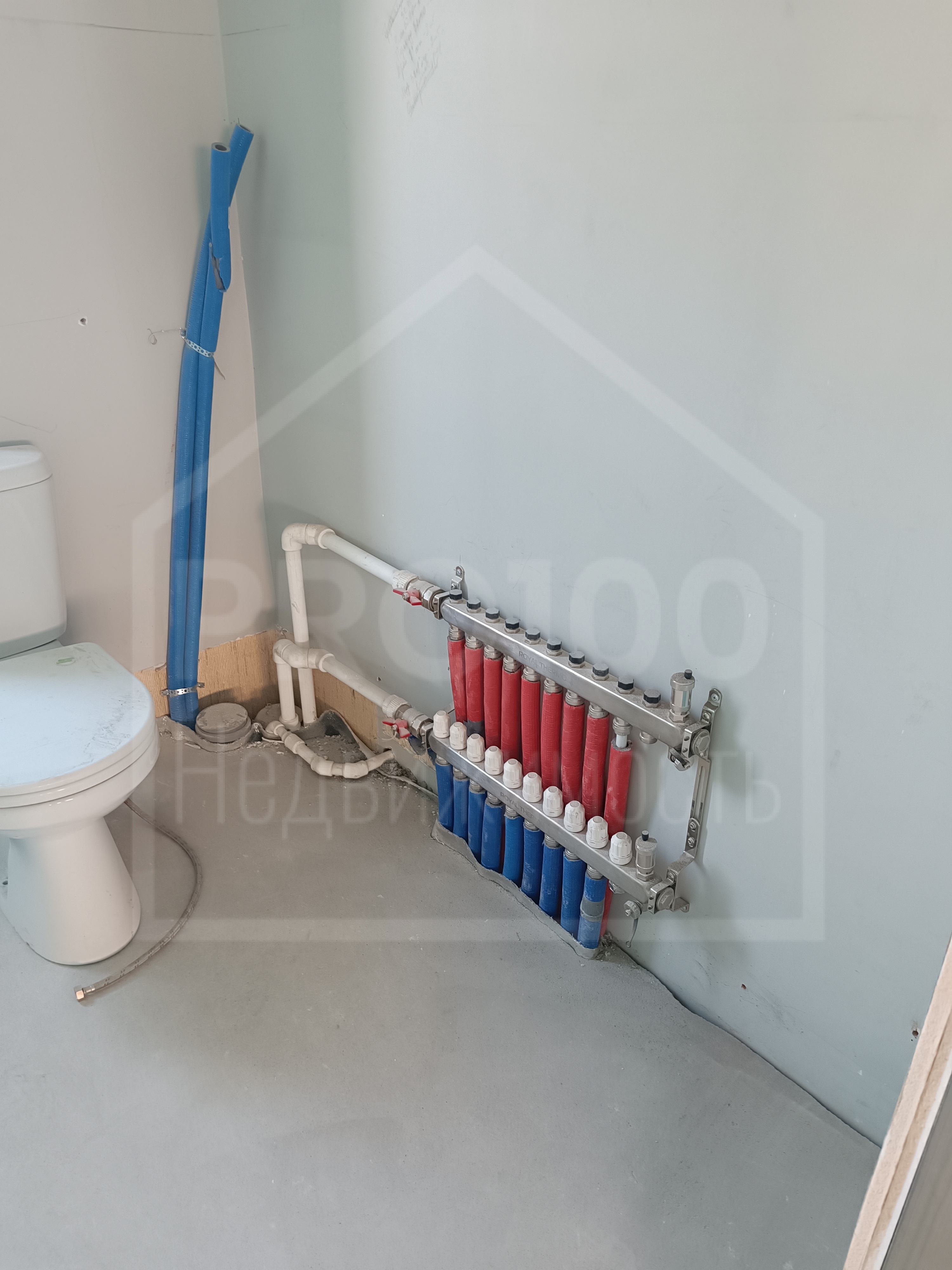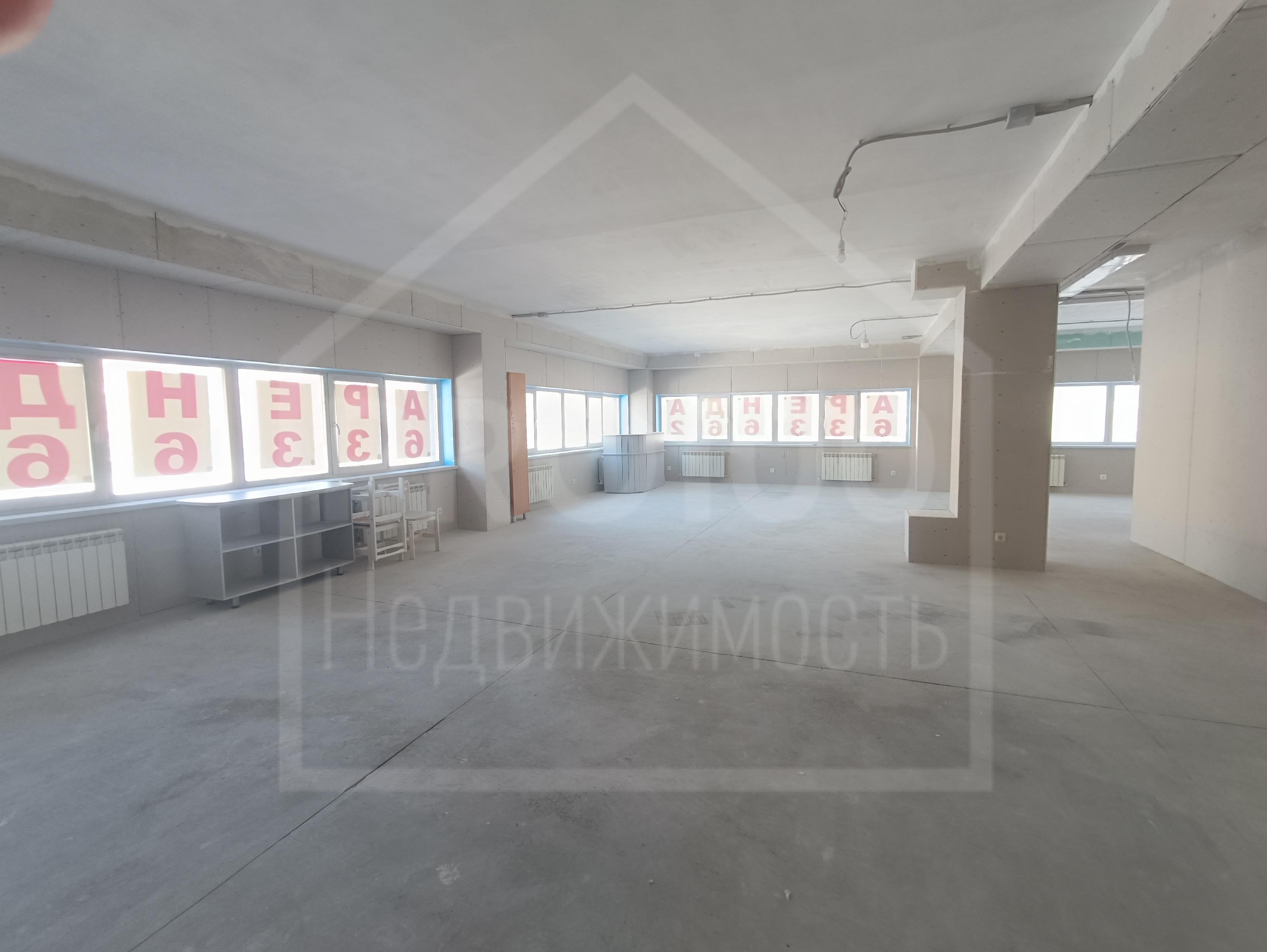 В настоящее время помещение освобождено от перегородок, организовано открытое пространство, сделан черновой ремонт, на полу бетонная стяжка.