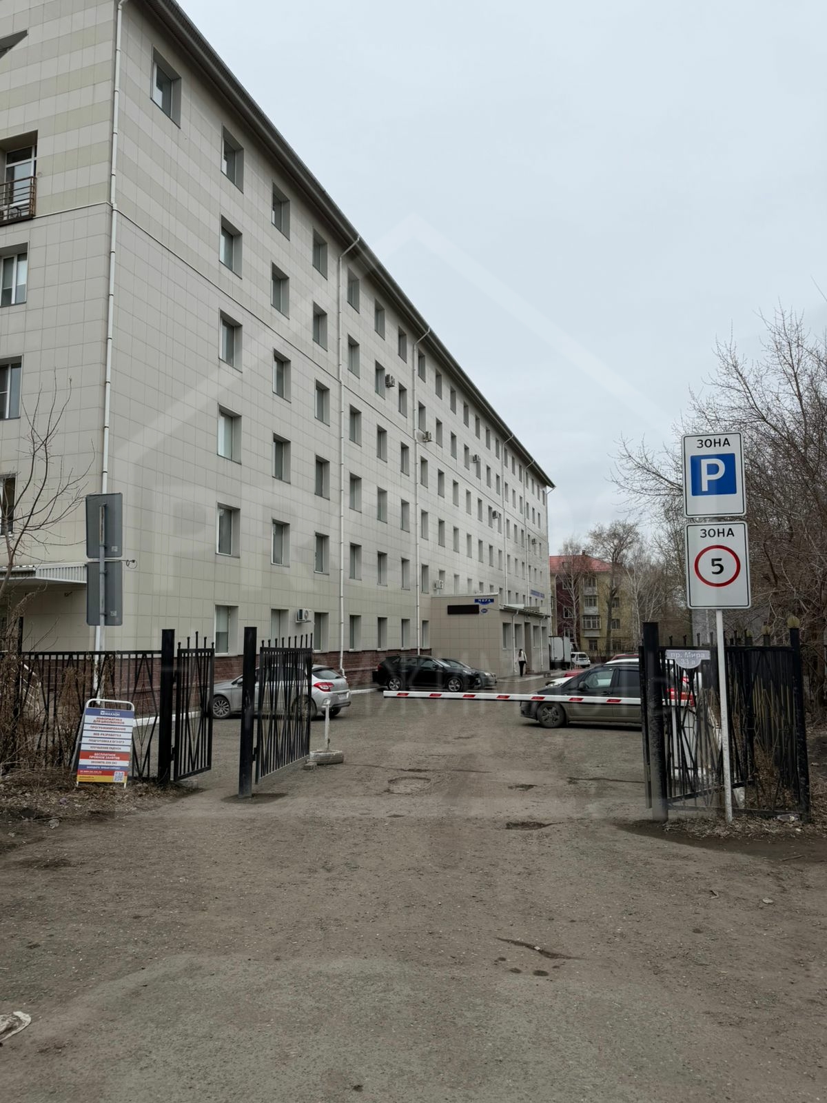 Парковка за шлагбаумом, во дворе.